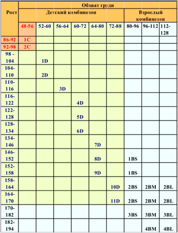 Таблица подбора размера: